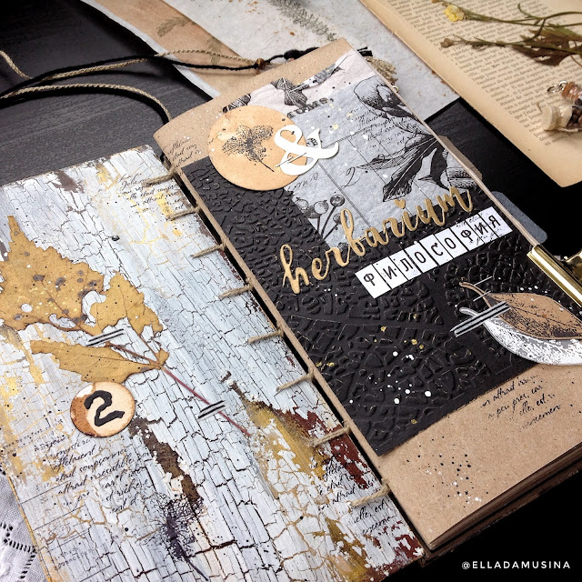 Моя скрап-философия гербария. Это черно-бело-крафт-золотая стилизация. Это сочетание упаковочной бумаги в качестве листов для наполнения блокнота с блеском золотого воска и акрила. Скромная красота и неброская эстетика засушенных растений, ботанические иллюстрации, напечатанные на бумаге и плёнке, быстрые скетчи и заметки о растениях. Открытый коптский переплёт.