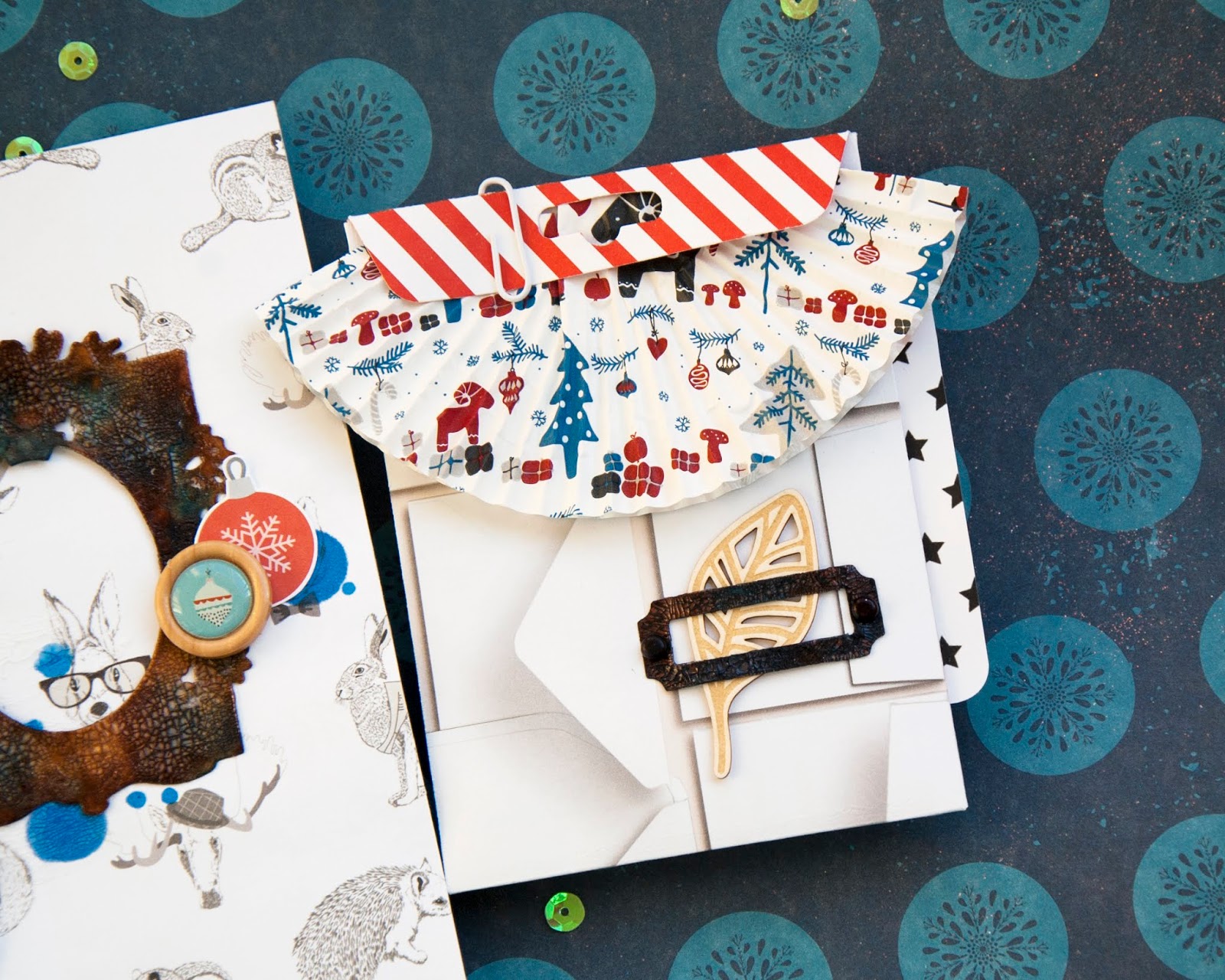 Конверт справа украсила стеклянным шаром. Именно его напоминает мне композиция благодаря раме от ножа "Распахни настежь окна". Внутри еще одна елки и фетровый домик из набора "Домики-2".