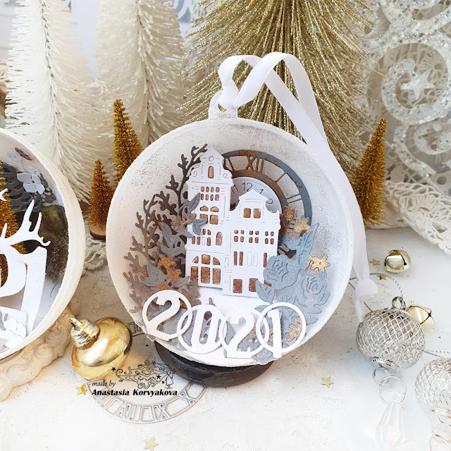 Внешнюю часть шариков покрыла белым гессо и посыпала белым глиттером. Если обратили внимание, то цифры блестят (тот же глиттер), как буд-то снег искрится!