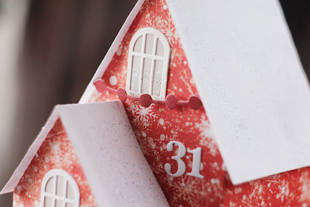 Окна и крыши припорошила "снегом" - пудрой для эмбоссинга. А большой домик украсила гирляндой из набора "Бусы развесили".